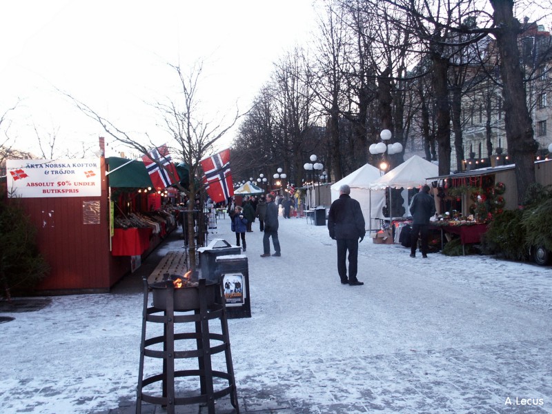 The Christmas market at Kungsträdgården. The red, blue and white flags are those of Norway.